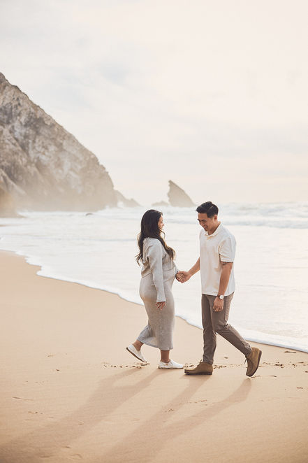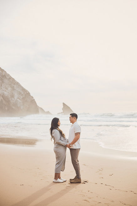 On their babymoon in Portugal, we met at Praia da Adraga — a wild, stunning beach cradled by cliffs and kissed by the ocean breeze. As the sun began to set, the sky turned soft, wrapping them in warmth and wonder.